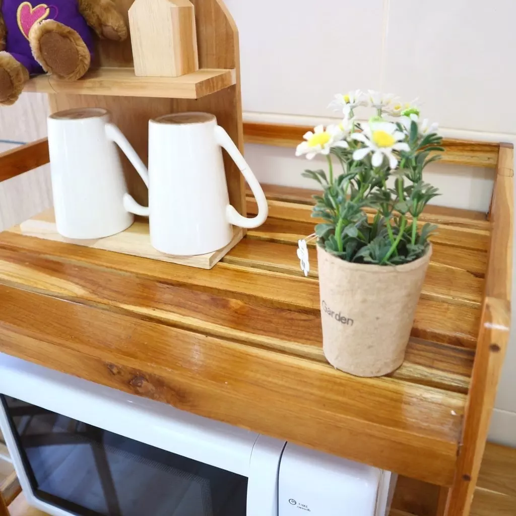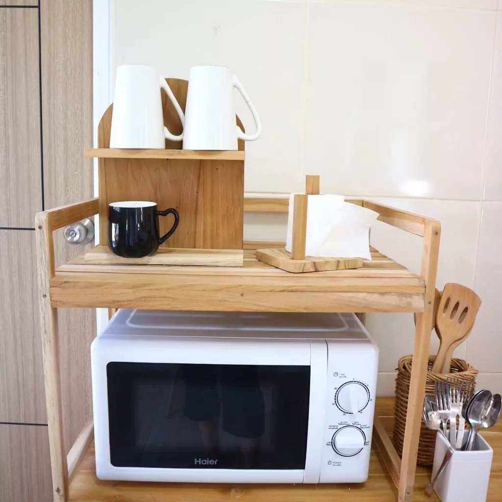 ทำจากไม้สักทนทานแข็งแรงใช้งานยาวๆได้เลย เพิ่มพื้นที่ใช้สอยบนเคาว์เตอร์ครัว ตู้เก็บของ สามารถเป็นชั้นวางเครื่องปรุง ไมโครเวฟ เครื่องชงกาแฟ วางหม้อหุงข้าว และของใช้อื่นๆ